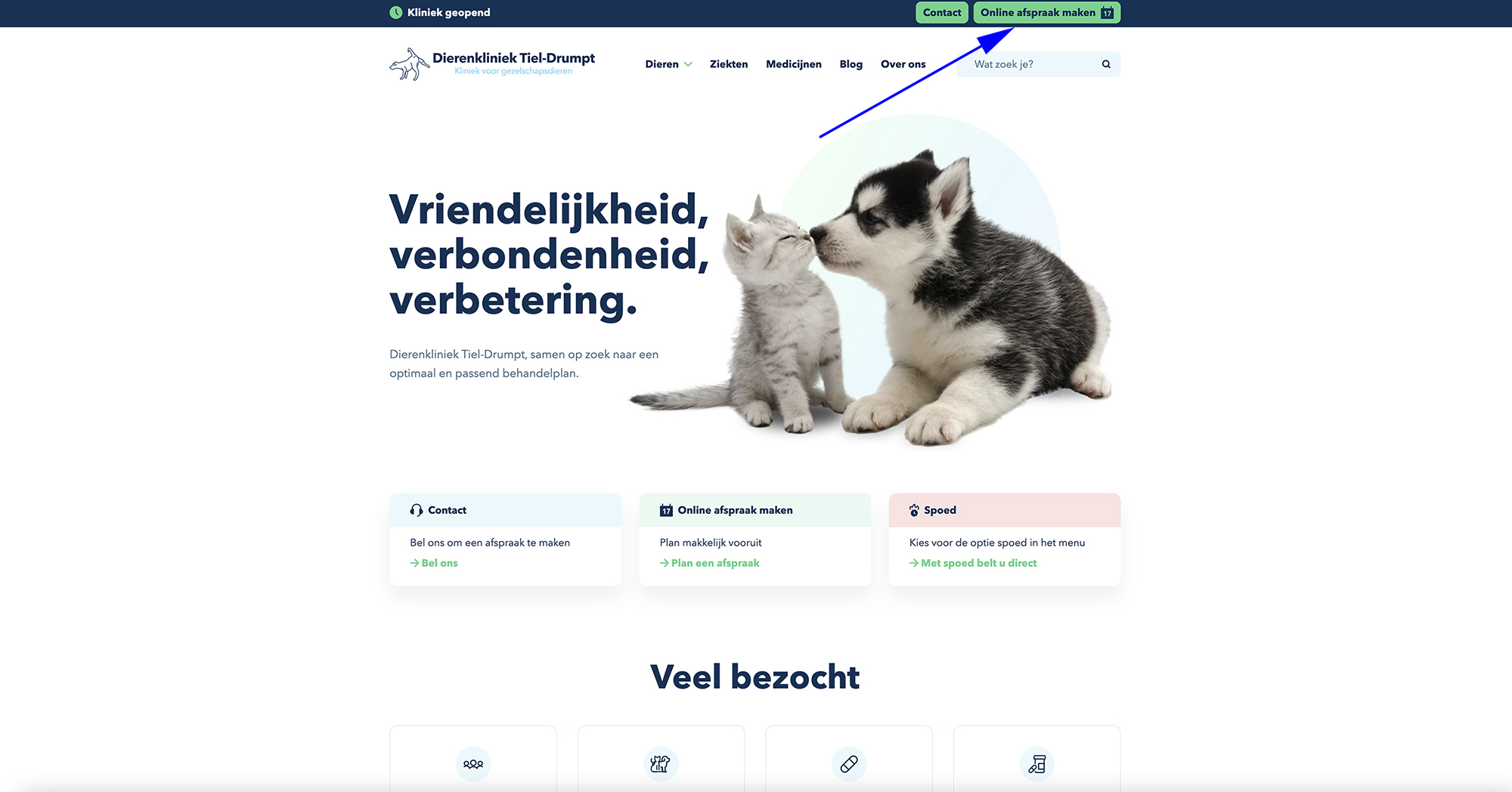 Er op onze website www.dierenkliniektiel.nl voor onze vaste klanten ook bestellingen voor voer of medicatie online geplaatst kunnen worden? Dit kan via de optie “Online afspraak maken”, zie pijl.