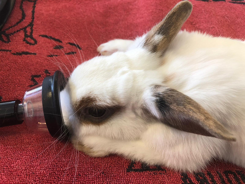 Bij binnenkomst controleren we het konijn: we meten de temperatuur, luisteren naar het hart en de longen en voelen of er geen aanwijzingen zijn voor problemen in de buik.