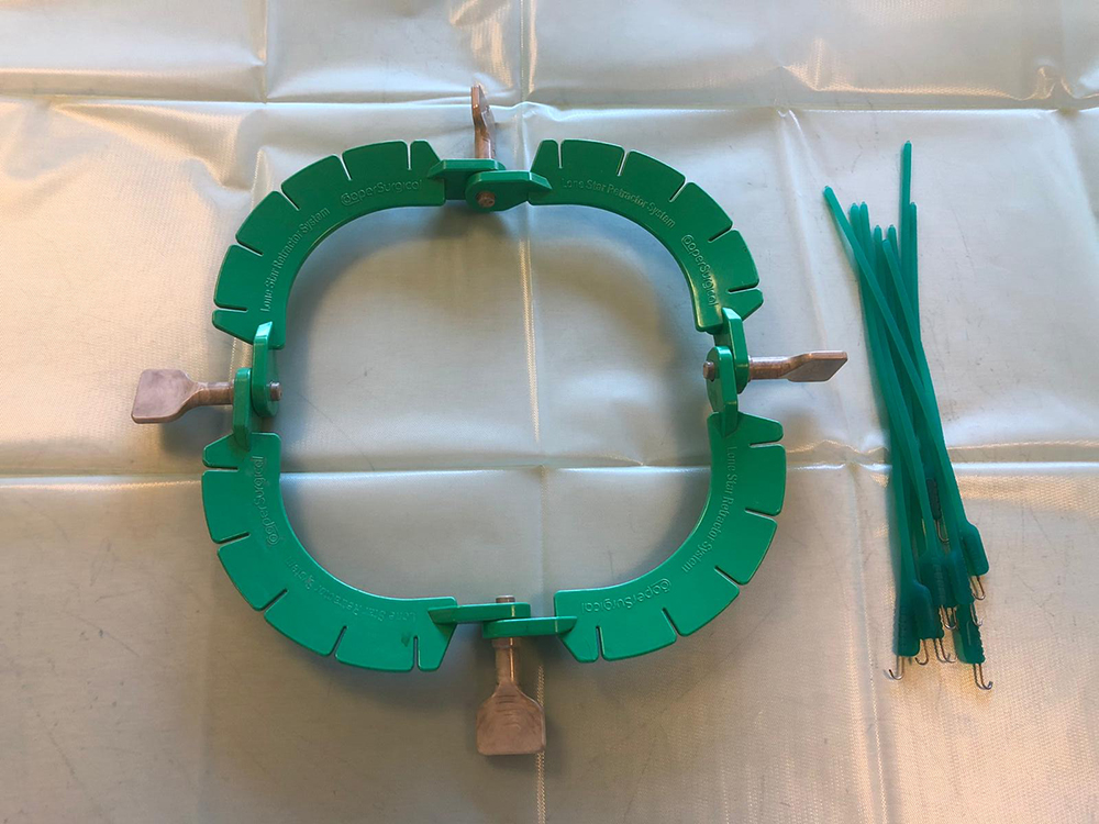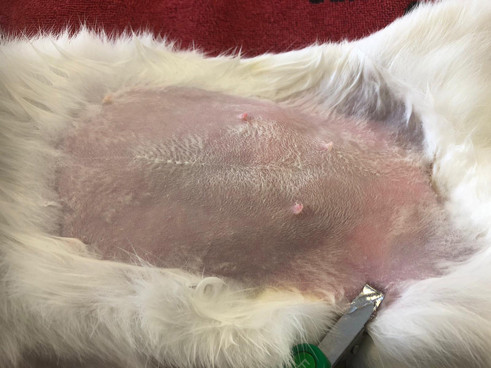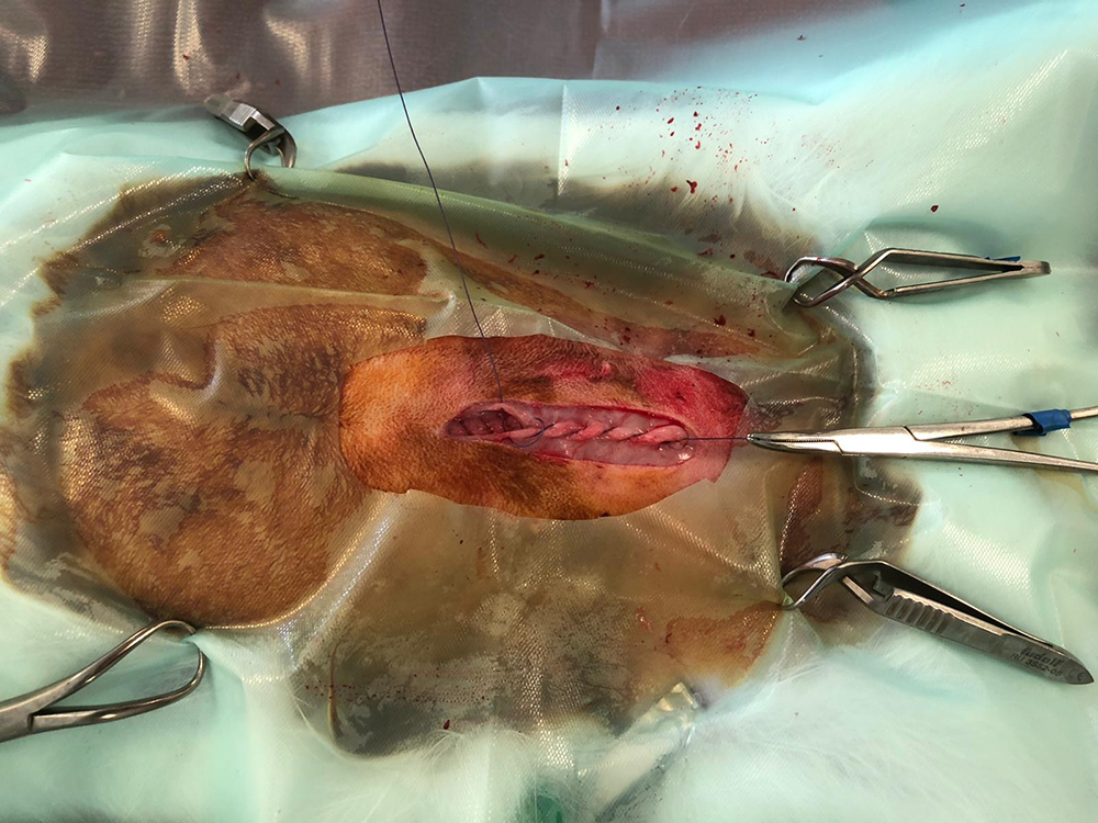 Nu kan de buik geopend worden, tot vlak voor het bekken. Om de buik open te houden, wordt de “lone star retractor” geplaatst. Hiermee is er goed zicht en werkruimte te verkrijgen. De eierstokken liggen bij het konijn vrij ver naar de zijkant, de darmen liggen vaak in de weg en zijn erg fragiel. Met de “lone star retractor” kan de sterilisatie veiliger worden uitgevoerd.