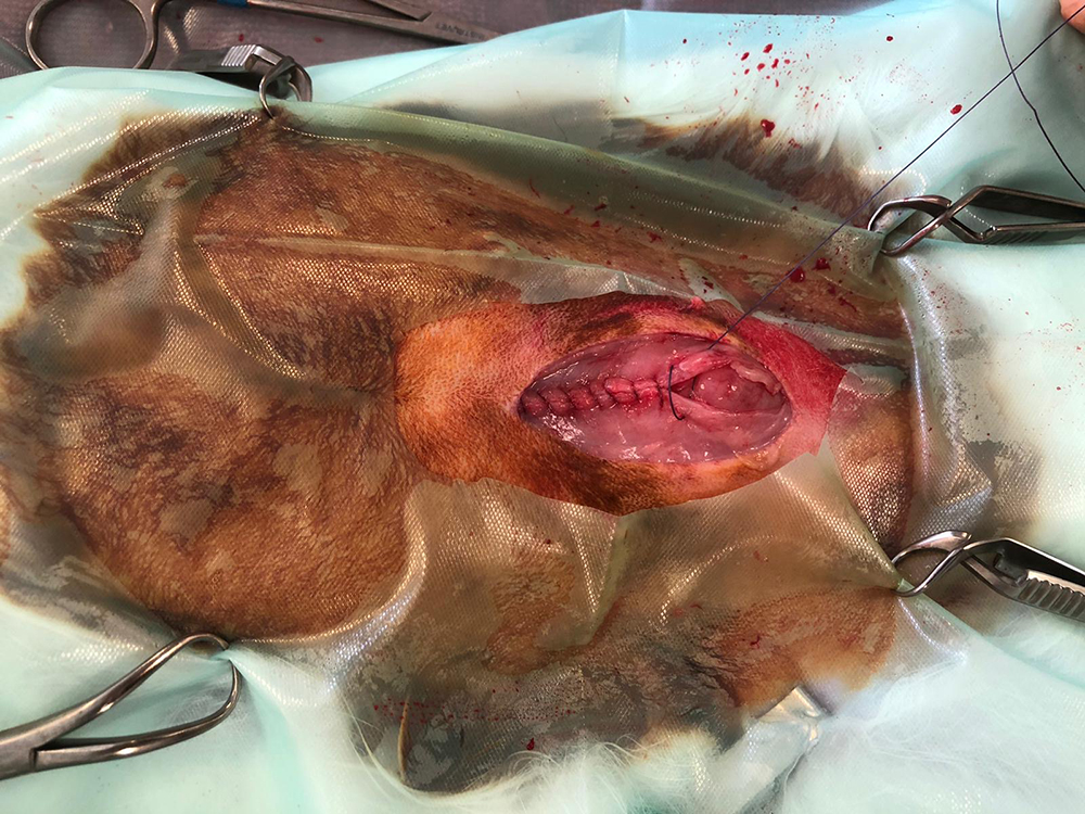 Omdat een konijn zijn nachtontlasting moet kunnen opeten voor de bacteriën, is een kraag niet aan te raden. Soms zetten we aan de buitenkant van de huid nog een aantal steunhechtingen voor extra veiligheid.
