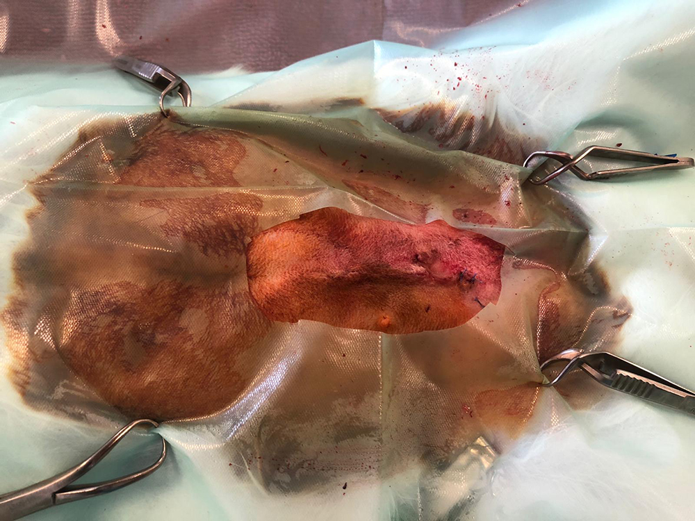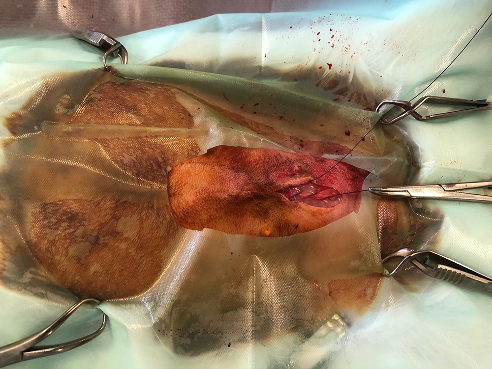 In de operatiekamer trekt de chirurg steriele handschoenen aan en wordt het konijn met een steriele doek bedekt. Vervolgens wordt het chirurgische instrumentarium klaargelegd.