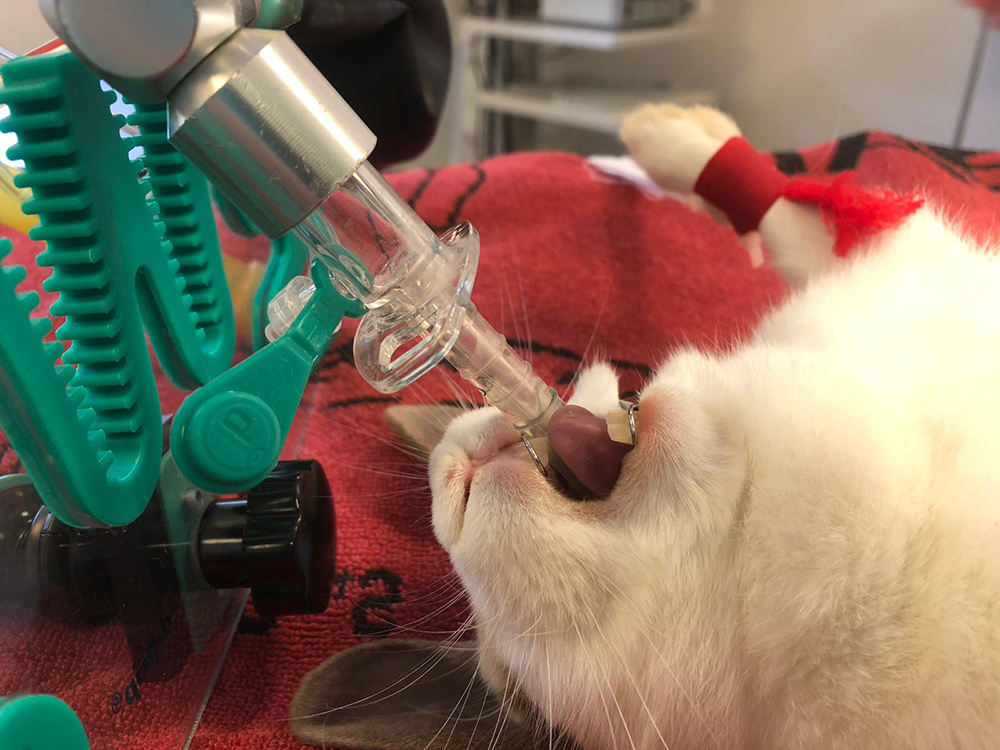 Nadat de voedster de narcose gehad heeft en in slaap is gevallen, wordt ze geschoren in de voorbereidingsruimte. Hierna gaat ze naar de operatiekamer, waar er een buisje (een V-gel, larynxmasker) in de keel wordt ingebracht. Zo kunnen we zuurstof en slaapgas toedienen en tevens de ademhaling monitoren, met behulp van een capnograaf.